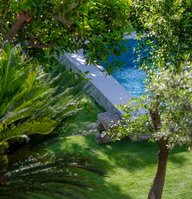 Scattered with citruses, olive trees, and Mediterranean shrubs like lavender and rosemary, the terraces hold many intimate alcoves with tables, chairs, and armchairs, ideal for spending time in solitude or socializing with loved ones. The spacious dining table and outdoor barbecue in the stone garden gazebo will bring the entire group together over delectable al fresco meals.